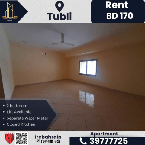 شقة للإيجار - توبلي 230 دينار بحريني. 3 غرف نوم واسعة، حمامان، مكيف هواء متوفر، خدمة المكيف مجانية، مصعد متوفر، مطبخ مغلق، عداد مياه مستقل، موقف سيارات متوفر، تصميم واسع جداً، بيئة عائلية هادئة ومريحة، موقع مميز في توبلي بالقرب من سيتي ريزورت، وسوبر ماركت الهيلي، وممشى توبلي، على بعد 2 كم فقط من معرض أنصار ومركز خدمة تويوتا بلازا. الإيجار 230 دينار بحريني (بدون رسوم الكهرباء والماء). اتصل أو راسلنا.