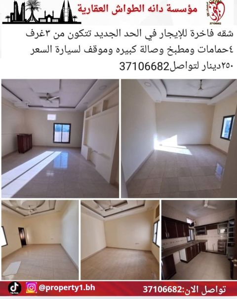 شقة فاخرة للإيجار في الحد الجديد تتكون من 3 غرف، 4 حمامات، مطبخ، صالة كبيرة، وموقف لسيارة. تم تخفيض السعر إلى 230 دينار. للتواصل.