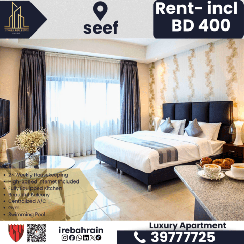 A fully furnished luxury apartment with two bedrooms and a living room, located in the Seef area - for only 400 Bahraini dinars. Prime location in Seef, including electricity and water services. Live a luxurious life in a high - end apartment equipped with the latest amenities. Enjoy an upscale lifestyle in a luxury apartment with first - class facilities. Apartment features two bedrooms, two bathrooms