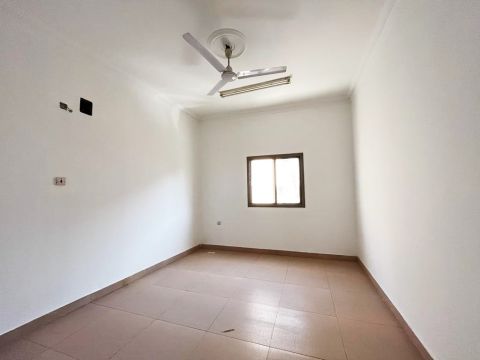 For rent in Riffa Al Hajiyat, a ground floor in a house with a private entrance, complete with a courtyard and parking for two cars. It consists of four bedrooms, two of which are master bedrooms, a living room with a bathroom, and a large kitchen. The price is only 380 dinars, excluding electricity. Contact us.