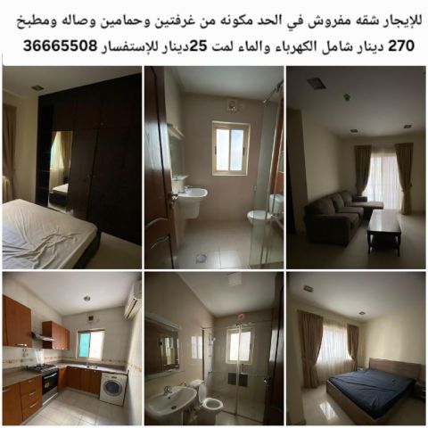 For rent: a furnished apartment in Al-Hadd consisting of two bedrooms, two bathrooms, a living room, and a kitchen for 270 dinars, including electricity and water, with a monthly fee of 25 dinars.