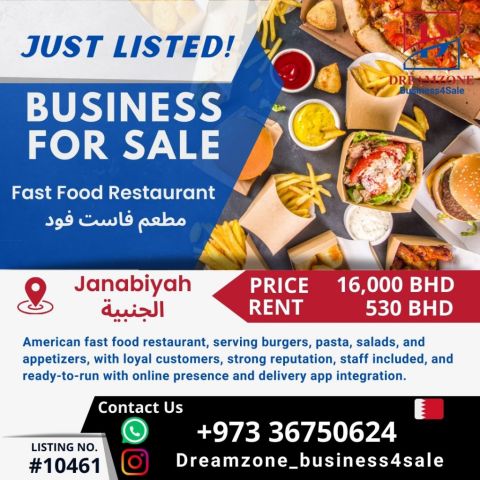 مطعم للبيع في المنامة - 4200 دينار بحريني. فرصة عمل ممتازة في موقع متميز في المنامة، على بعد خطوات فقط من المستشفى الأمريكي، مما يضمن حركة مرور عالية للقدم وتدفق قوي للعملاء. موقع تجاري متميز - منطقة ذات حركة مرور عالية - مطعم يعمل بكامل طاقته ومربح - سجل تجاري نشط مع 5 تأشيرات - سعر بيع معقول وقابل للتفاوض - تسليم سلس واعداد جاهز للتشغيل. فرصة مثالية لأي شخص يتطلع الى بدء أو توسيع نطاق عمله في المجال