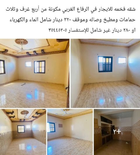 For rent: a ground-floor apartment in West Riffa, near West Riffa Preparatory School for Girls. 3 large rooms, 2 bathrooms, a living room, a kitchen, and a parking space. Price 200 dinars, excluding electricity and water.
