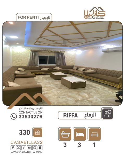 For rent: An apartment in Riffa East - Abu Quwara, suitable for families and close to the Services Society. Apartment specifications: 3 bedrooms - 3 bathrooms - living room + sitting area - kitchen - balcony - semi-furnished - fully renovated, including water and electricity. Rental price: 330 Bahraini dinars. For contact and inquiries.
