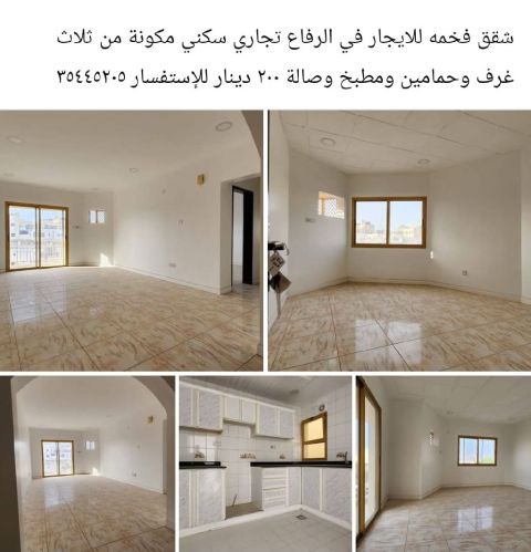 A luxurious apartment for rent in Riffa Commercial, consisting of 3 rooms, 2 bathrooms, a kitchen, and a hall for 200 dinars.