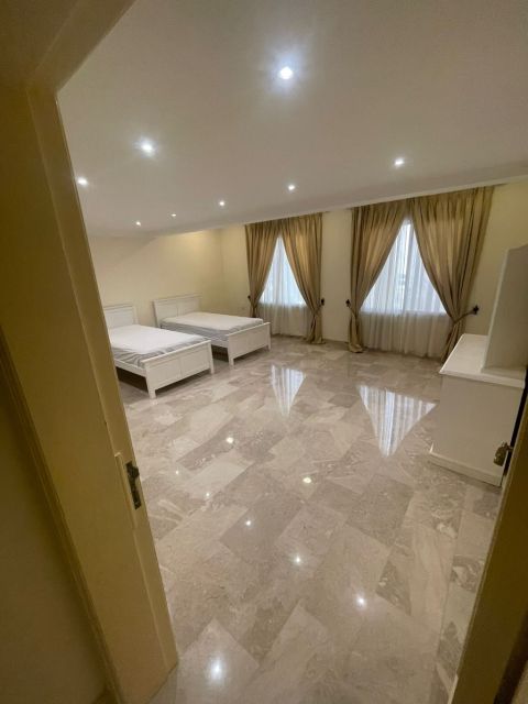 Five luxurious villas for rent in Campaoun, Northern Riffa. Each villa consists of a ground floor, first floor, and second floor. All villas include 7 bedrooms with private bathrooms, 3 living rooms, 3 kitchens, a private swimming pool, and a private garage for two cars. Services include security, split/central air conditioning, curtains and electrical appliances, cabinets, and 24-hour maintenance. Available with partial or full furnishings. Rent includes electricity and other utilities. Prices start from 800 to 1100 dinars. We are happy to answer your inquiries.