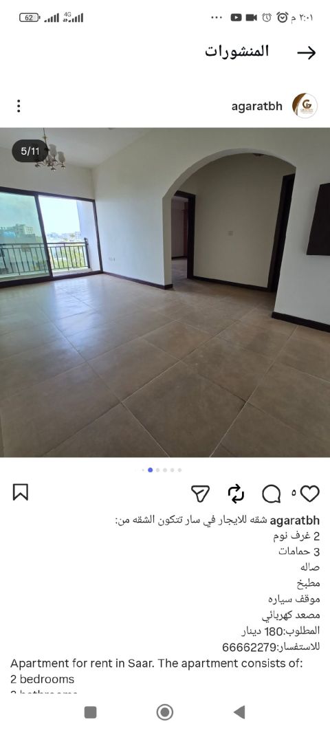 شقة للإيجار في سار. تتكون الشقة من غرفتي نوم، حمامين، صالة، مطبخ، بلكونة، مصعد، وموقف سيارة. الإيجار 190 ديناراً. للاستفسار، اتصل على 66662279. ملاحظة: توجد شقة للإيجار في الطابق الأرضي في نفس المبنى.