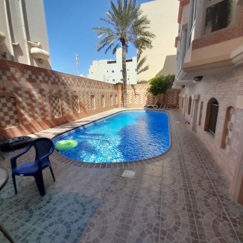 Furnished apartment for rent in Sar, near the school. 2 bedrooms, 2 bathrooms, living room, kitchen, swimming pool. 400 dinars, excluding electricity.
