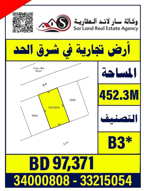 Commercial land in East Hadd, excellent location, complete infrastructure, area 452.3 meters, classification B3, price 97,371 thousand dinars, agency Sar Land Real Estate.