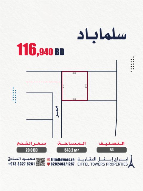 Eiffel Towers Real Estate Company offers for sale a land in Salmabad with an area of 543.2 square meters. Classification: Multi-use buildings, 3 floors - B3. Price per square foot: 20 BD. Total price: 116,940 BD. For contact: Mahmoud Al-Sadiq.