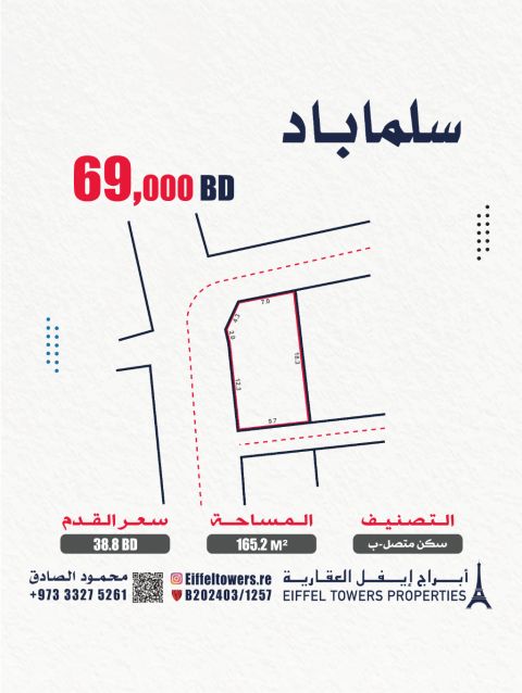 Eiffel Towers Real Estate Company offers for sale a land in Salmabad with an area of 165.2 square meters, classified as residential attached (with RHB). The price per square foot is 38.8 Bahraini dinars, and the total price is 69,000 Bahraini dinars. For contact, reach out to Mahmoud Al-Sadiq via eiffeltowers.re. The company is a licensed broker approved by the Real Estate Regulatory Authority, license number B202403/1257.