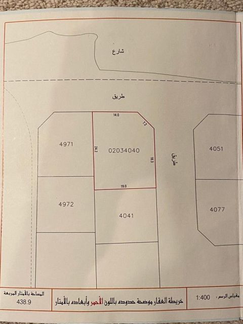 For sale, a residential land in Samahij, corner with two frontages on two streets, area 438.9 square meters, classification residential RA, price per square foot 30 dinars, total price 141,730 dinars.