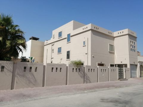 A luxurious villa for sale in Sanad. Land area 619.5 SQM, built - up area 750 SQM. 5 spacious bedrooms, jacuzzi in the master bedroom, 7 bathrooms, two open living rooms connected to each other, a guest room on the upper floor, Moroccan design, two fully equipped kitchens, a large dining area, front garden, a glass - designed cafe in the outer garden, garage for two cars, large windows for the halls