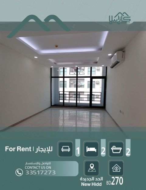 For rent: An apartment in Al-Hadd Al-Jadeed with air conditioners. It consists of 2 bedrooms, 2 bathrooms, a living room, a kitchen, a balcony, an elevator, and parking. The rental price is 270 dinars, including electricity and water, without commission. Contact for more information.