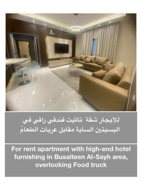 For rent: A luxurious, hotel-furnished apartment in Al Basta, Al Seef, overlooking food trucks. It has two bedrooms, two bathrooms, a living room, and a kitchen. The price is 420 dinars, with an electricity limit of 20 dinars.
