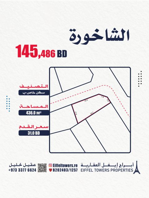 Eiffel Towers Real Estate Company offers for sale a land in Al-Shakhura with an area of 436 square meters, classified as private residential (RB). The price per square foot is 31 Bahraini dinars, and the total price is 145,486 Bahraini dinars. For contact: Aqeel Khalil, eiffeltowers.re, eiffeltowers.re, a licensed broker approved by the Real Estate Regulatory Authority, license number B202403/1257.