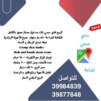 للبيع نادي صحي مجهز بالكامل ذو دخل ممتاز، يقع في المنامة. المساحة 550 متر مربع. جميع الاجهزة الرياضية متوفرة. غرف تبديل ملابس منفصلة للرجال والنساء. استوديو للدروس الجماعية. غرف بخار للرجال والنساء. إيجار المركز يشمل الكهرباء 1400 دينار. عدد الأعضاء يصل الى 600 مشترك. سعر البيع 60000 دينار، يشمل الاجهزة والموظفين والرخصة. البيع بسبب دواعي السفر