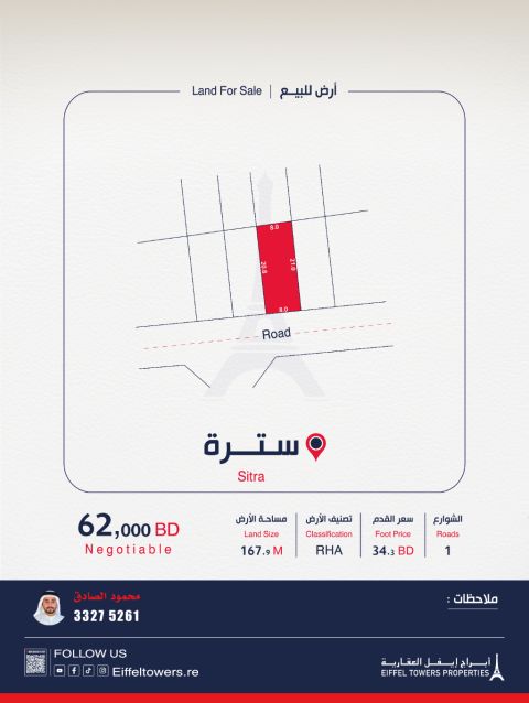 Eiffel Towers Real Estate Company offers for sale a land in Sitra with an area of 167.9 square meters, classified as residential connected (RHA). The price per square foot is 34.3 Bahraini dinars, and the total price is 61,989 Bahraini dinars. For contact: Mahmoud Al-Sadiq, eiffeltowers.re, eiffeltowers.re, a broker certified by the Real Estate Regulatory Authority with license number B202403/1257.