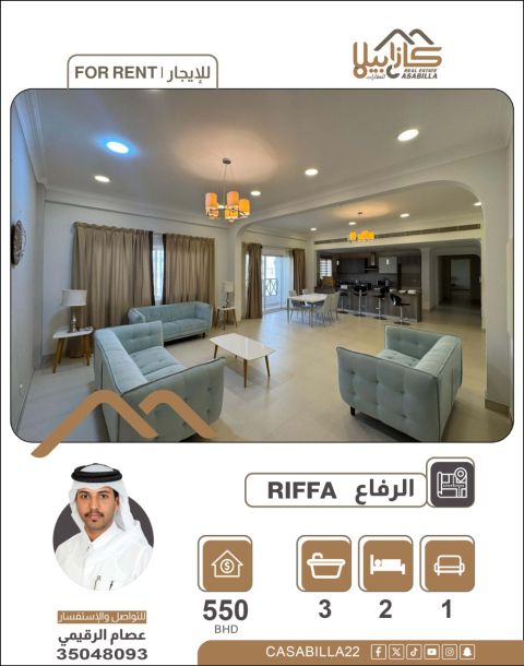 A semi-furnished apartment for rent in Riffa Al-Bahir with super deluxe finishing in a new building, first occupant. It has 3 bedrooms, a laundry room, 3 bathrooms, a kitchen, a living room, an elevator, and a parking space on the first floor. The rent is 450 dinars without electricity or 500 dinars including electricity.