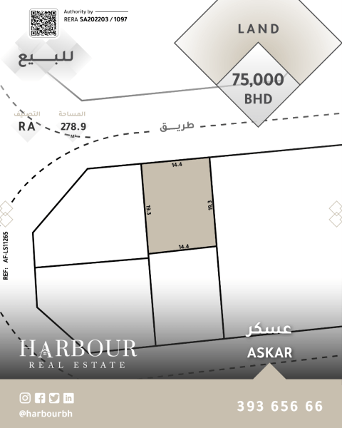 للبيع: أرض في عسكر بمساحة 278.9 متر مربع، مصنفة RA. السعر: 75,000 دينار بحريني. للاستفسار، اتصل على AF - LS 11265 عبدالله فضل + harbourbh harbourrent AF - LS 11265.