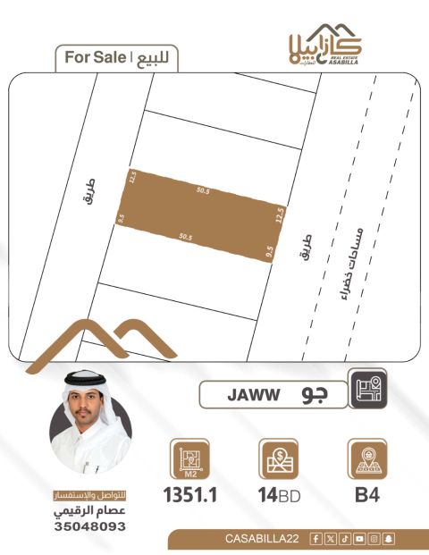 A distinctive investment land for sale in the Jow area, classified as B4, priced at 200,000 BHD. An investment opportunity to own a large land with a strategic location in the Jow area. The land is characterized by its classification that allows multiple building options, making it ideal for residential or investment projects. Details: Area 1351.1 square meters - Land classification B4 (connected residential areas - B). Location: the quiet and upscale Jow area. Total price: 200,000 Bahraini dinars. For contact and inquiries.