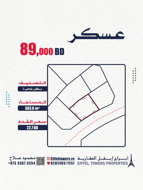 Eiffel Towers Real Estate Company for sale of land in Askar (Khalifa City). Area: 363.6 sqm. Classification: Private Residential (A RA). Price per square foot: 22.7 BD. Total price: 89,000 BD. For contact: Mahmoud Salah. eiffeltowers.re. Licensed broker approved by the Real Estate Regulatory Authority, License No. B202403/1257.