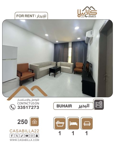 For rent: A fully furnished, elegant studio in Bahrain, close to everything. It is fully furnished with a room, kitchen, and bathroom, and includes a living area. The rent covers electricity and water. The building is new with an elevator, located in a quiet and safe area near all services. Monthly rent is 250 dinars, including electricity and water. For contact.