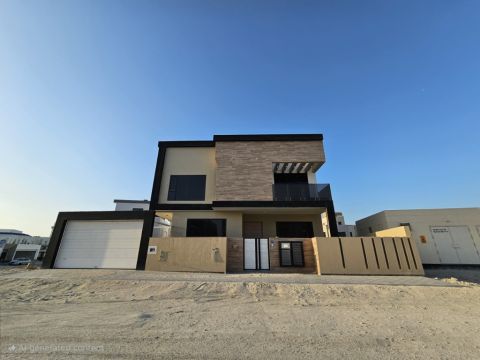 For sale, a villa in Durrat Al Bahrain, Al Fayrouz Island 2, consisting of two floors, 3 master bedrooms, a maid's room, a main hall, a dining room, a reception hall, a kitchen, and a garden with a swimming pool overlooking the beach, shaded by tents, and a parking space. The asking price is 350,000 Bahraini dinars, negotiable within reason.