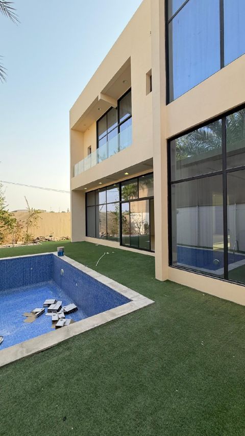 For rent: An elegant villa in Riffa with a land area of 500 square meters, two floors, 5 bedrooms, 5 bathrooms, a fully equipped kitchen (refrigerator, washing machine, oven, microwave), a laundry room, a maid's room, central air conditioning, a garden, a spacious parking area, and a storage room. The monthly rent is 650 dinars, not inclusive.