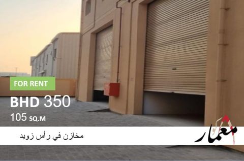 For rent: warehouses in Ras Zuwid with an area of 105 square meters, 4 units available, rental price per unit is 350 dinars.
