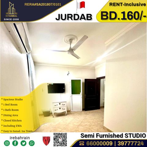 Semi furnished Studio Apartment for rent in Jurdab BD160/ Including EWA. This apartment is semi furnished with high quality materials, well equipped kitchen, bedrooms wardrobes, dining section etc. rent is BD160/ only including EWA. Easy to Isa Town, Sanad, Tubli etc