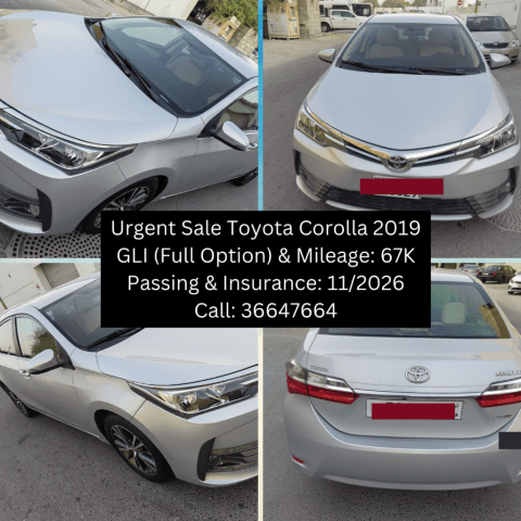 Urgent Sale - Toyota Corolla 2019 GLI Full Option with Low Mileage. Well-maintained Toyota Corolla 2019 GLI (Full Option) with only 67,000 km. Passing & Insurance valid until 11/2026. Clean condition, smooth drive, and ready to use. Contact for details.