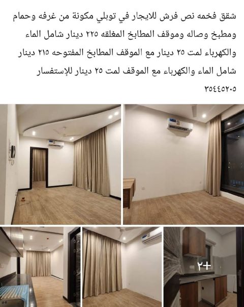 شقق فاخرة نصف مفروشة للإيجار في توبلي، تتكون من غرفة نوم واحدة ومطبخ وحمام وصالة وموقف سيارات. المطابخ المغلقة تكلف 225 ديناراً تشمل الماء والكهرباء، مع رسوم موقف 25 ديناراً. المطابخ المفتوحة تكلف 215 ديناراً تشمل الماء والكهرباء، مع رسوم موقف 25 ديناراً.