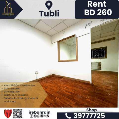 Commercial shop for rent in Tubli, 260 Bahraini dinars. Location: Tubli (near Mazda service center, behind Fakhr Al Bahrain). Area: 40 square meters + half floor. Three-phase electricity available. Toilet available. Suitable for trade, commercial shops, or workshop. Rent: 260 Bahraini dinars per month.