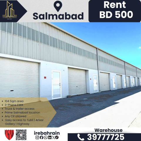 Warehouse/Workshop for Rent - Salmabad. Area: 104 square meters. Rent: 500 Bahraini Dinars. Suitable as a warehouse or workshop. Area: 104 square meters. Three-phase electricity. Access for trucks and trailers allowed. All types of licenses permitted. Prime location in Salmabad. Easy access to Tubli, Ansar Gallery, and the highway. 500 Bahraini Dinars per month.