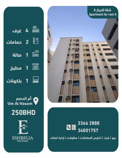 We have a building consisting of (7) apartments for rent in the Umm Al-Hasam area, close to services behind Lulu Hypermarket. Group A consists of (4) apartments with suitable size. Apartment components: 4 bedrooms, 2 bathrooms, 1 kitchen, 1 living room, 1 balcony. The requested price is (250) dinars. License number B201804/0125. For contact: Ishbiliya Office, Bu Abdullah. Ad number (95).