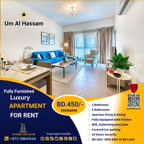 Fully furnished 2 BHK Luxury Apartment for rent in Umm Al Hassam BD450. This 2 BHK apartment is located in Umm Al Hassam. Prime location. It consists of 2 bedrooms, spacious living & dining area, 2 bathrooms, fully fitted wide kitchen, WiFi, swimming pool, gym, covered car parking, 24 - hour security. easy access to Adliya, Zinj, Mahooz, Manama, Seef, Juffair, Airport, etc. rent is BD450 with EWA