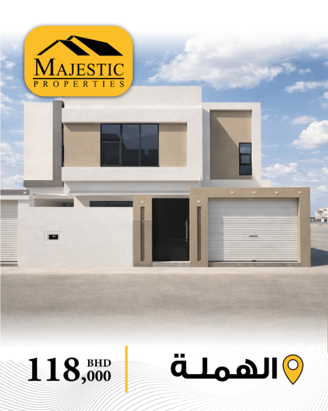 دومينز العقارية للبيع: فيلا سكنية للبيع في الهملة، قريبة جداً من شارع المزارع. مساحة الفيلا 300 متر مربع، والسعر الإجمالي 14,000,000 دينار بحريني. تتكون من الطابق الأرضي: 3 غرف نوم، 4 حمامات، صالة، مجلس، كراجين، غرفة طعام، ومطبخ. الطابق الأول: 5 غرف نوم، 3 حمامات، صالة كبيرة، وغرفة غسيل. مساحة الأرض 300 متر مربع، مساحة البناء 540 متر مربع، العمر 5 سنوات، بناء محترم شخصي، فيها مدخلين، يمكن فصل الطابق.
