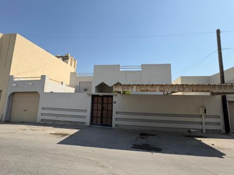 Dominions Real Estate for sale: A villa in A'ali near Al-Ramli Complex, featuring a wide 33-meter frontage and easy access. The villa consists of two floors and a service annex. The ground floor includes two separate majlis (living rooms), two halls, a master bedroom, a fully equipped kitchen, 3 bathrooms, a guard room, and parking for two cars. The first floor has 5 master bedrooms, a hall, a preparation kitchen, and 3 distinctive balconies. Additional features include central air conditioning, two spacious gardens, the possibility to build a swimming pool, and a separate annex for an outdoor kitchen, laundry room, and storage.