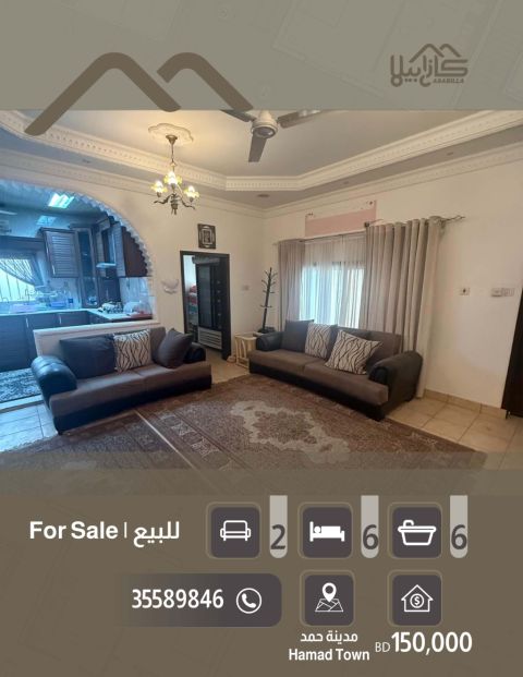 For sale, a villa in a prime location situated on a street with two lanes in a quiet and ideal residential area. Hamad City - Roundabout 5. The asking price is 150,000 dinars. Land area is 310 square meters. Ground floor building area consists of a garage for two cars, a garden, two halls, an external kitchen, an internal kitchen open to the hall, a dining room, a storage room, and two bathrooms. First floor: a new apartment consisting of two rooms, two bathrooms, two halls, a kitchen, distinctive additions, three bedrooms, three bathrooms, and a maid's room with a bathroom.