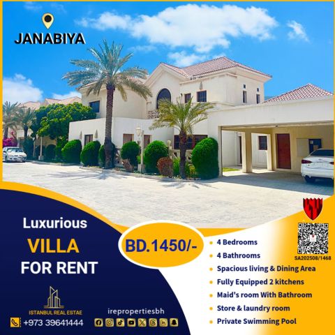 فيلا فاخرة مؤثثة للإيجار في الجنبية - 1450 دينار بحريني. أبرز مميزات العقار 4 غرف نوم واسعة مع اضاءة طبيعية وفيرة. 4 حمامات مصممة بشكل جيد. مناطق معيشة وطعام واسعة، مثالية للعائلات أو الضيوف. مطبخان، أحدهما مفتوح والآخر مغلق، كلاهما مجهز تجهيزا جيدا. مساحات اضافية تشمل مخزن وغرفة غسيل. غرفة للعاملة المنزلية مع حمام ملحق. منطقة حديقة وحمام سباحة خاص. موقف سيارات مغطى. الموقع يوفر سهولة الوصول الى سار