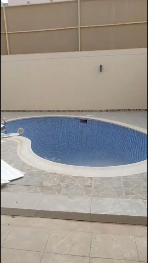 فيلا نظيفة مع مكيفات للإيجار في الرفاع البحري. تحتوي على 3 غرف نوم، 3 حمامات، صالتين، مطبخ، غرفة غسيل، موقف سيارة داخلي، حوش داخلي، مسبح، بالكونة، واطلالة على المسبح. السعر 500 دينار بدون كهرباء