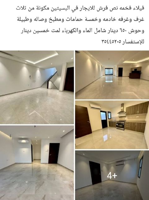فيلا فخمة نصف فرش للإيجار في البسيتين مكونة من ثلاث غرف وغرفة خادمة وخمسة حمامات ومطبخ وصالة وطبيلة وحوش. 650 دينار شامل الماء والكهرباء، مع عربون خمسين دينار.