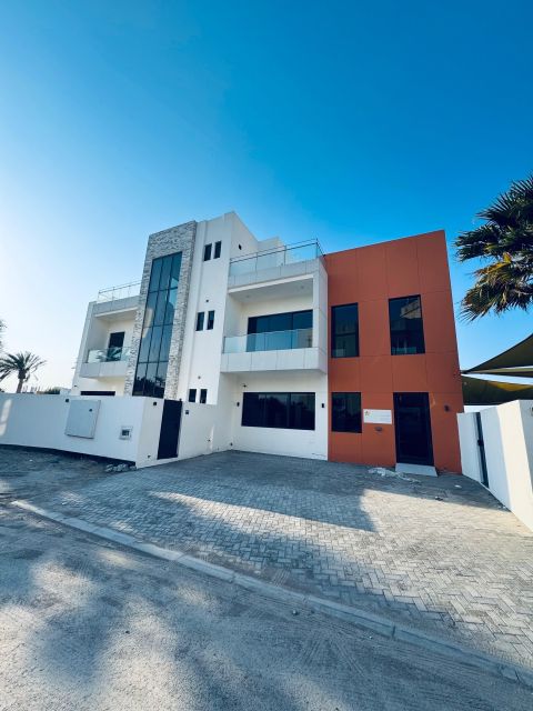 A semi furnished villa for rent in Al Mahooz, Bu Ashira area, with air conditioners, a refrigerator, and an oven. It has two floors, comprising 5 bedrooms, a maid's room, 5 bathrooms, two living rooms, and a laundry room. This villa includes a large swimming pool, a small garden, and two private parking spaces. It is located in an ideal location, priced at 1300 dinars, not inclusive, and negotiable
