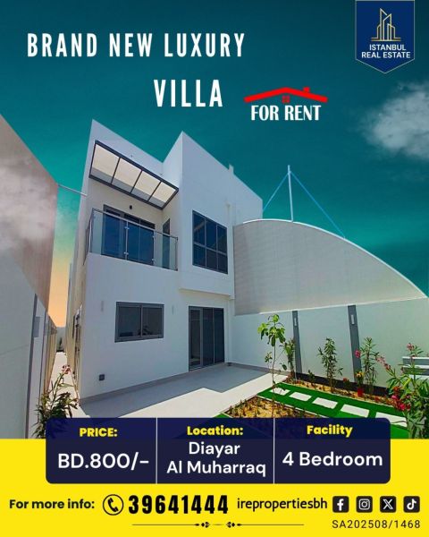 For rent: a new, luxurious villa, first occupant, including electricity and water, in the Diyar Al Muharraq area. It consists of 4 bedrooms, a majlis, two living rooms, 4 bathrooms, a spacious kitchen, a balcony, a backyard garden, a garage for two cars, and ample parking in front of the villa. Semi-furnished. Price 600 dinars, including electricity and water.