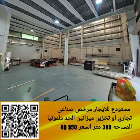 For rent: a licensed commercial/industrial or storage warehouse with 3-phase electricity. Area: 380 square meters, includes a mezzanine and a bathroom. Located in Delmonia. Price: 950 dinars. For contact.