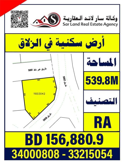A distinguished apartment in Zallaq on 3 residential streets, classified as RA, with an area of 539.8 SQM, priced at 156880.9 thousand dinars, by Sare Land real estate Agency