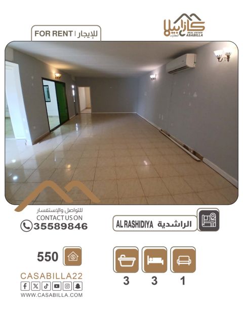 فيلا للإيجار في منطقة الراشدية السعر 550 دينار، يشمل الكهرباء والماء. نصف مفروشة موقع مميز وقريب من جميع الخدمات. تفاصيل الفيلا 3 غرف نوم (واحدة ماستر) 3 حمامات، صالة واسعة، مطبخ عملي، حديقة خاصة، جيم رياضي. فرصة مميزة للسكن الراقي والراحة