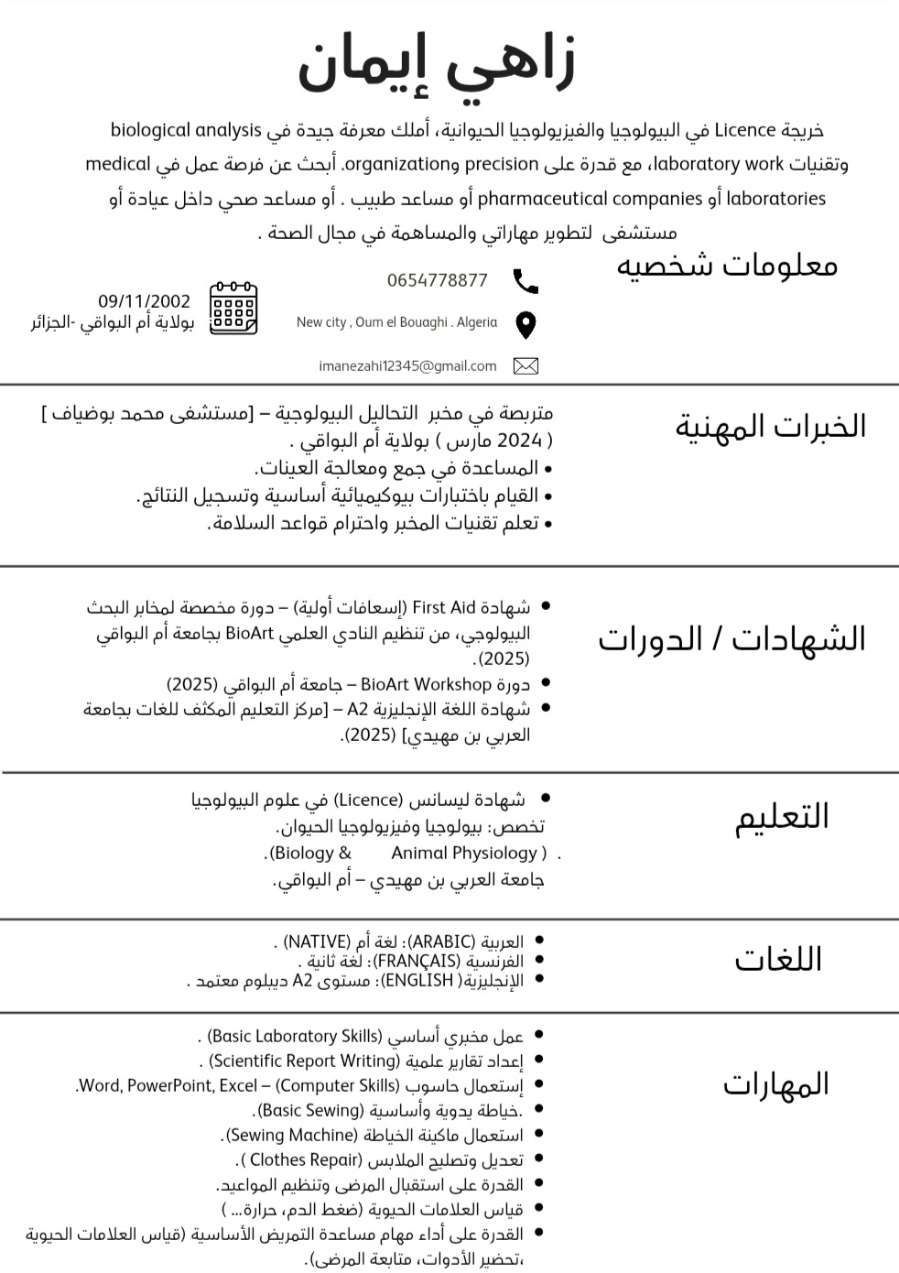 أنا ايمان من الجزائر، حاصلة على شهادة ليسانس في البيولوجيا تخصص فيزيولوجيا حيوانية من جامعة العربي بن مهيدي. ابحث عن عقد عمل في المملكة العربية السعودية في مجال تخصصي أو في أي مجال ذي صلة بالعلوم البيولوجية أو المخبرية. المهارات والخبرات معرفة جيدة بآليات عمل الخلايا ووظائف الأعضاء الحيوانية. خبرة في التقنيات المخبرية وتحليل العينات قدرة على اعداد التقارير العلمية ومتابعة التجارب البيولوجية