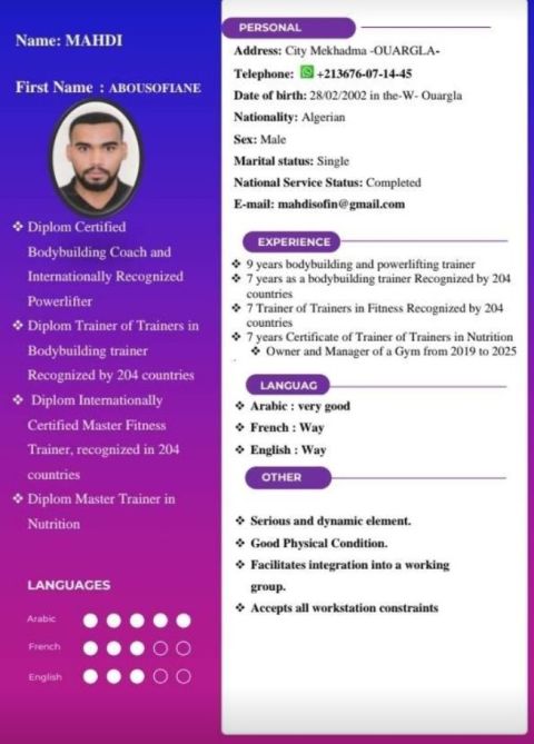 رياضي لكمال الأجسام وحامل بالقوة ولياقة بدنية ومصمم في البرامج لدي 9 خبرة في التدريب الشخصي الذي اعمل مصمم لبرامج تدريبية جماعيه اللياقة البدنية قوة تميزني تشجيع المتدربين الذي مهتم يراسلني أو يتصل
